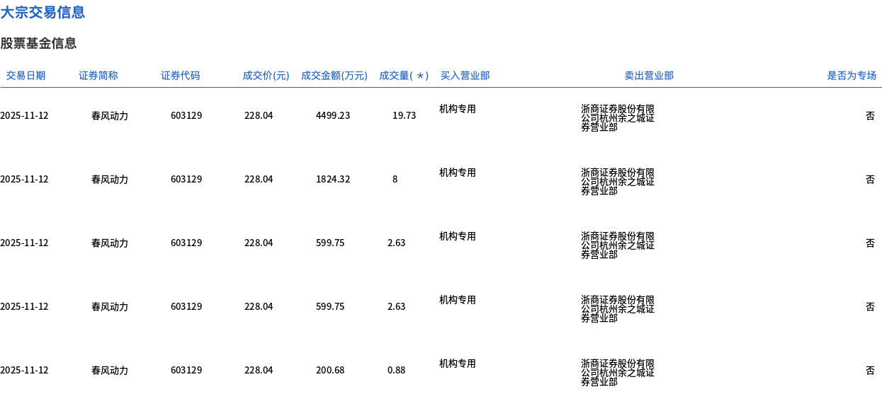 11月12日,春风动力大宗交易成交33.87万股,成交额7723.73万元,占当日总成交额的33.76%,成交价228.04元,较市场收盘价244.96元折价6.91%。